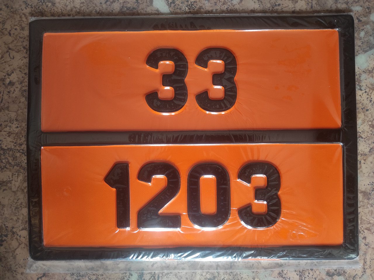 Таблиця металева для вантажного автомобіля померанчева штампована "Небезпечний вантаж. Бензин. 33/1203".